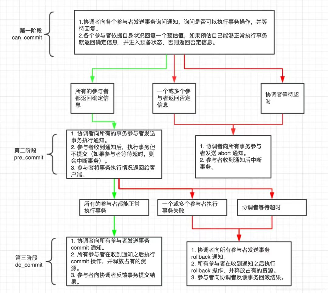 - 3PC 是在 2PC 的基础上进行改进的分布式事务协议,主要是为了减少 2PC 中的阻塞问题和单点故障风险。它分为三个阶段: